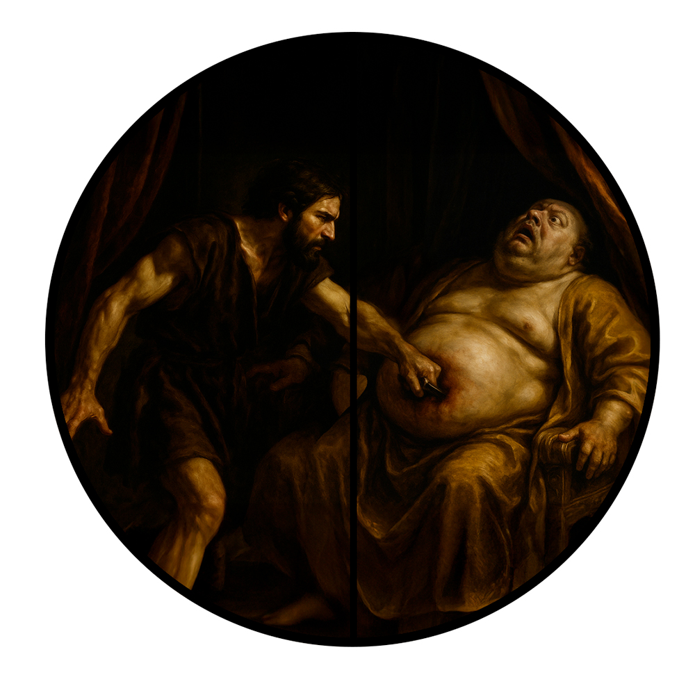 "And United ("Ehud") is sending away the self eternal hand of the left of himself, and he is taking the self eternal dagger from out of the loin of the right side of himself, and he is blasting her into the belly of himself. "
